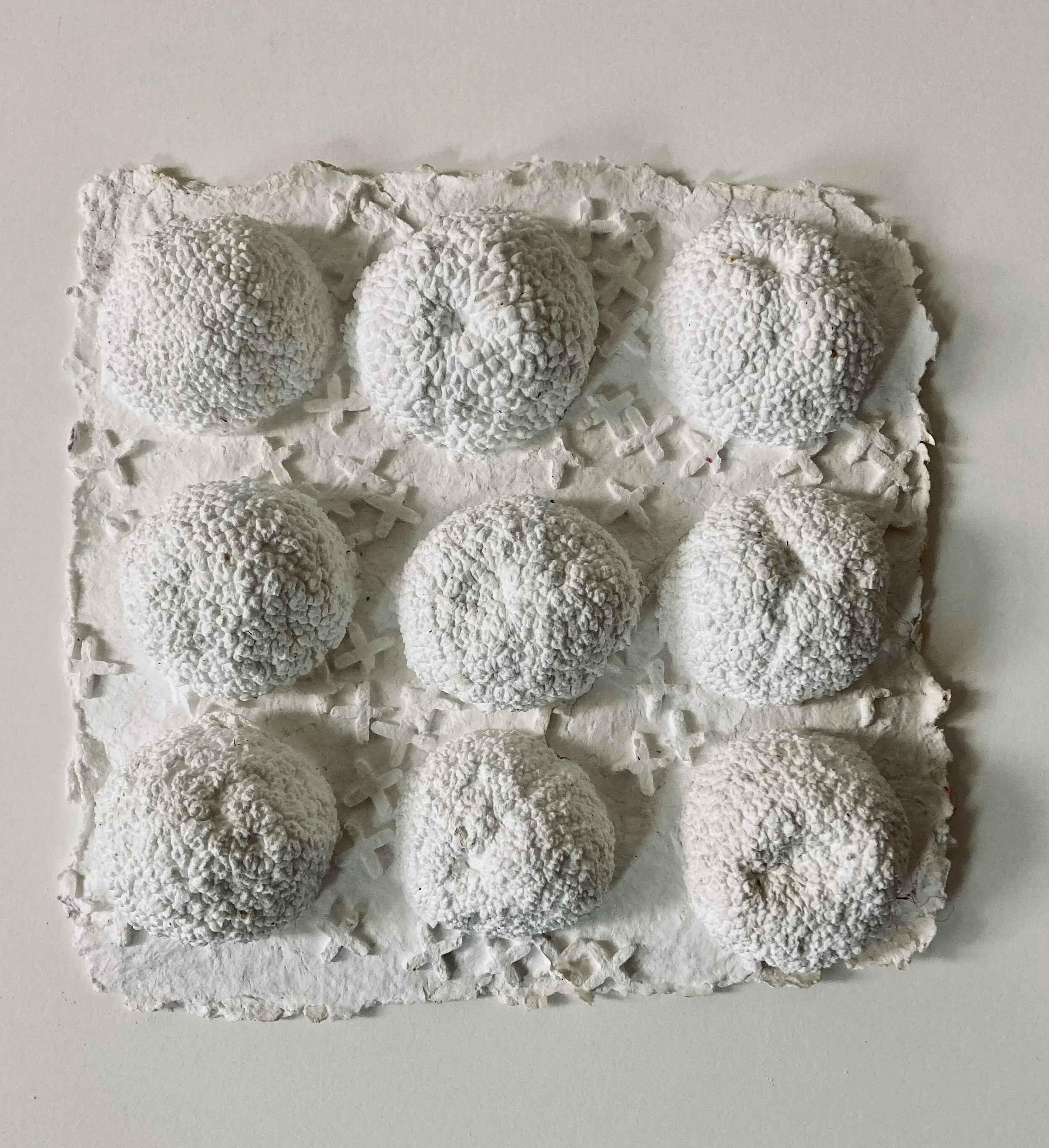I had seen the large Osage orange fruit every autumn of my life, never knowing what they were. Last year I finally picked some up, took them home, and figured out what they were. Lovely, tough, pebbly skin hides a seed inside. To commemorate their persistence, I made this cast paper sculpture.