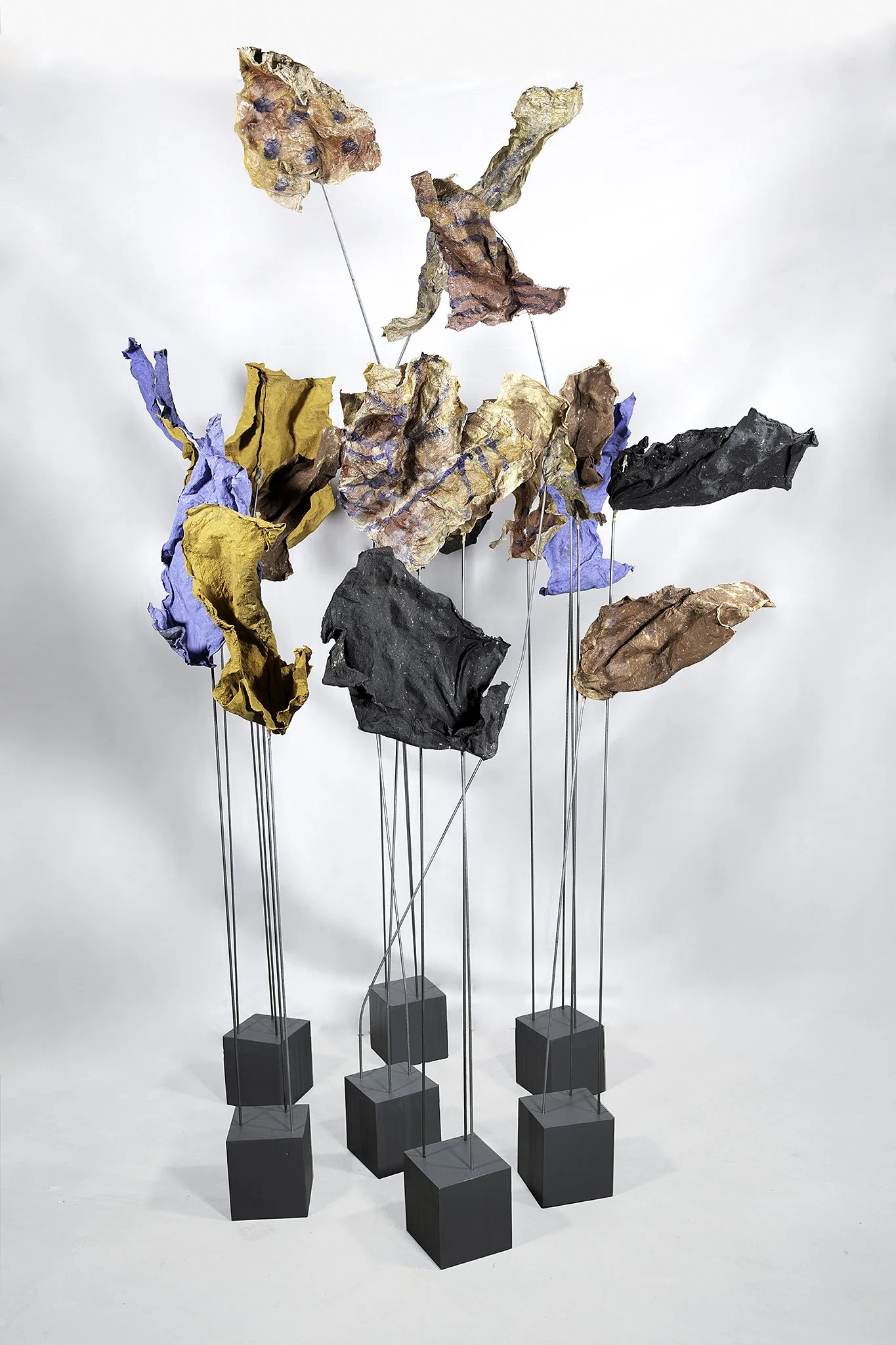 2023, Steel, artist made papers from old bedsheets, denim, iron, rust,