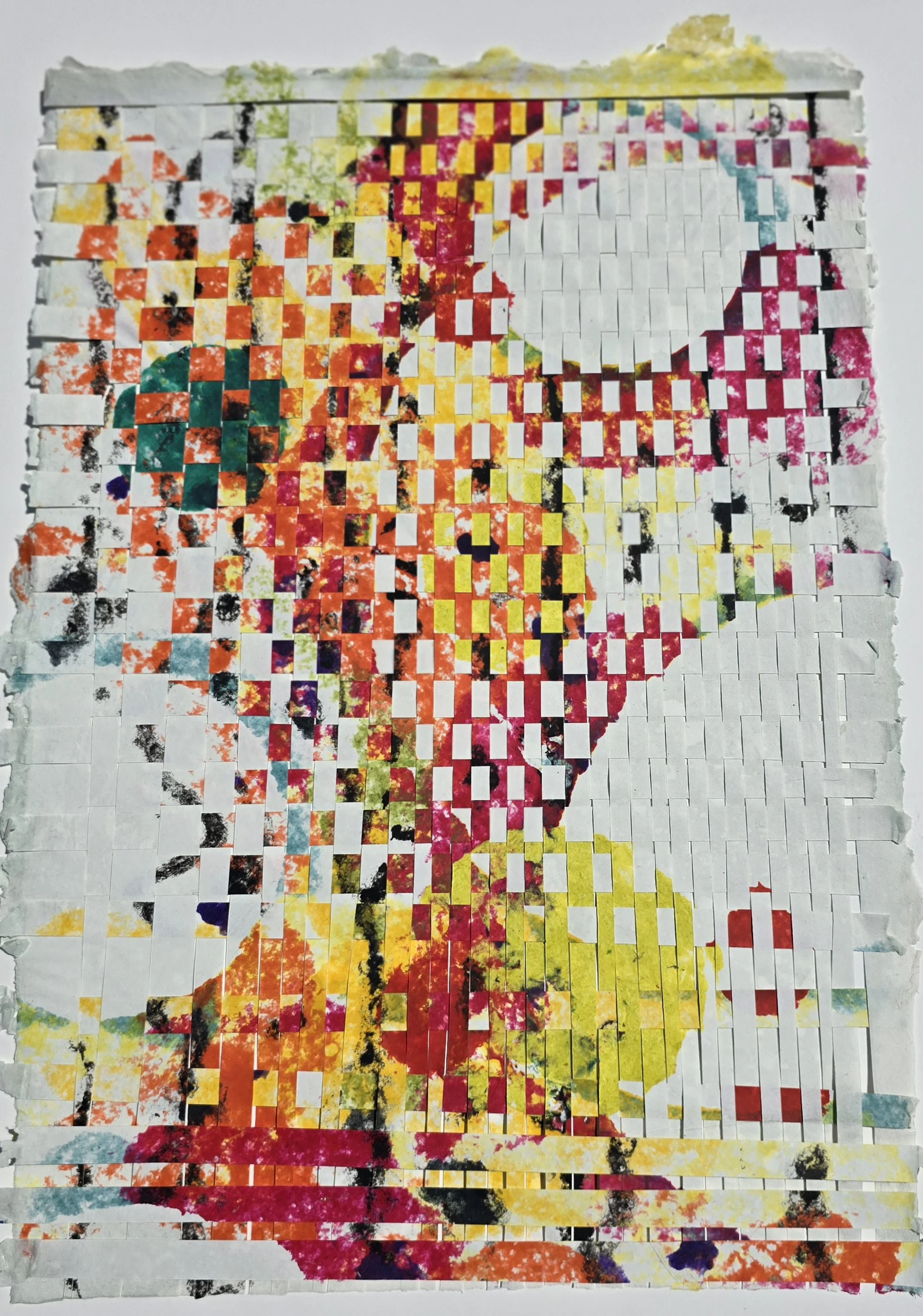 2024, Monoprint with fiber reactive dyes and handwork on canvas with woven strips of self-made pigmented paper (50% recycled fibers, 50% cotton/abaca, pigments), woodcut, acrylic, and watercolor on cotton fabrics,