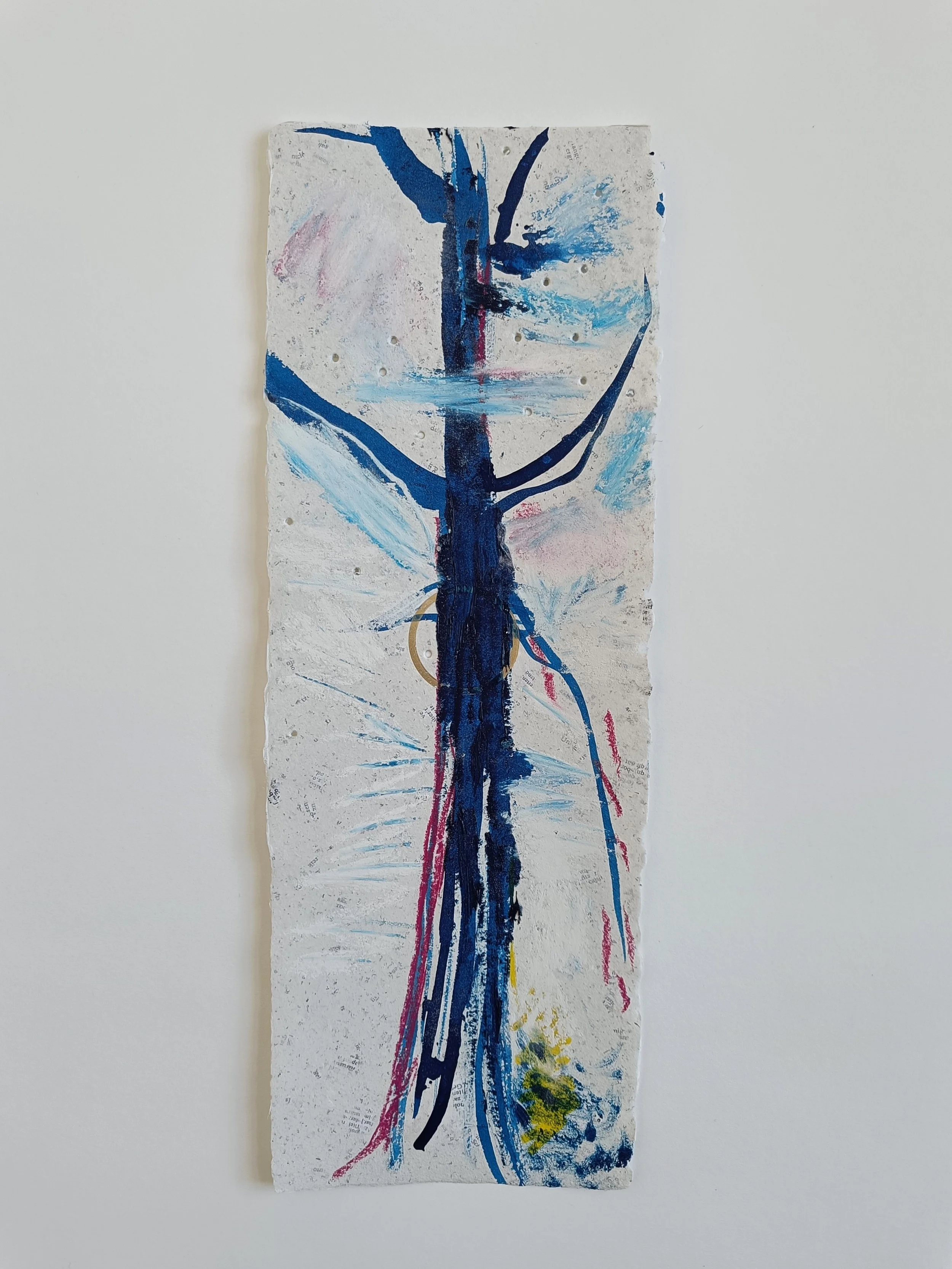 2024, Ink drawing, gold embossing on handmade paper, oil color, pastel, ink brush pen, punching, 41 x 14 cm