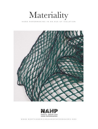 Materiality: Hand Papermaking in the Age of Isolation was the 2020 North American Hand Papermaker's Juried Exhibition. The exhibition and catalogue consists of 42 artists who are utilizing hand papermaking techniques or working with handmade paper. This full catalogue of the artists and artworks featured in the exhibition was edited by Steph Rue and Jaz Graf, with design and layout by Maria Amalia Wood.